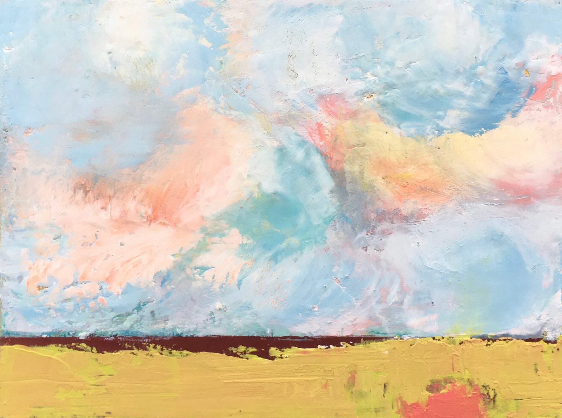 “Big Sky”is a cold wax and oil painting done on hardboard.