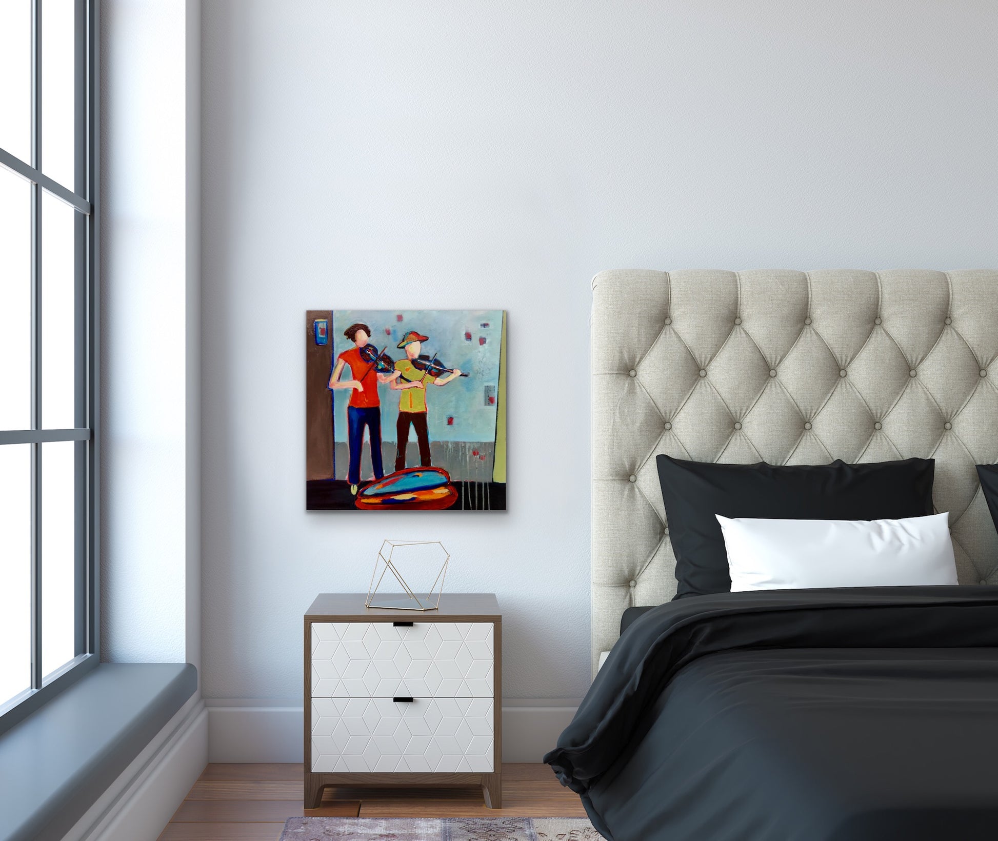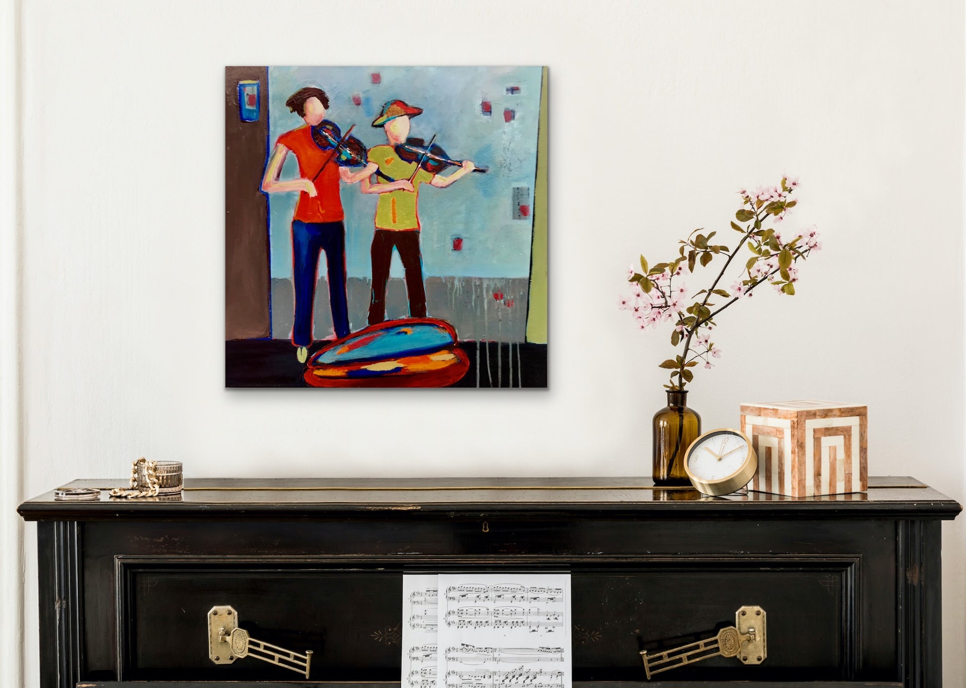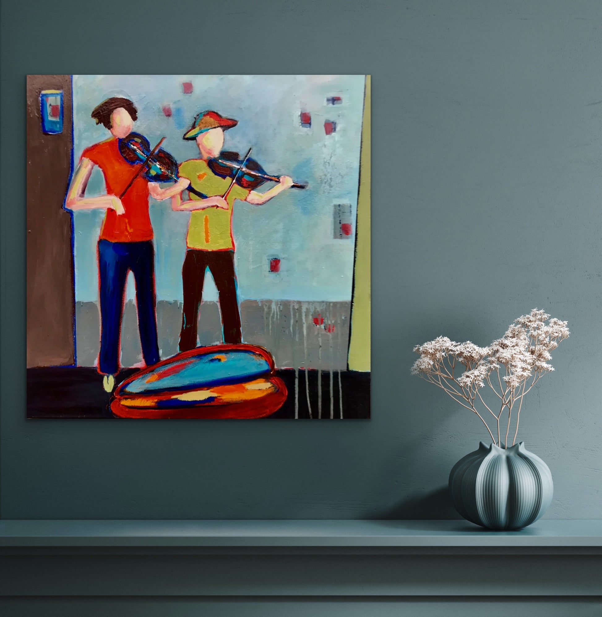 Buskers, a 24x24” original painting, features two young lads busking with fiddles at a market. Professionally painted on canvas with painted edges, it comes with hanging hardware ready to hang. Perfect for any music enthusiast looking to add a unique piece to their collection!