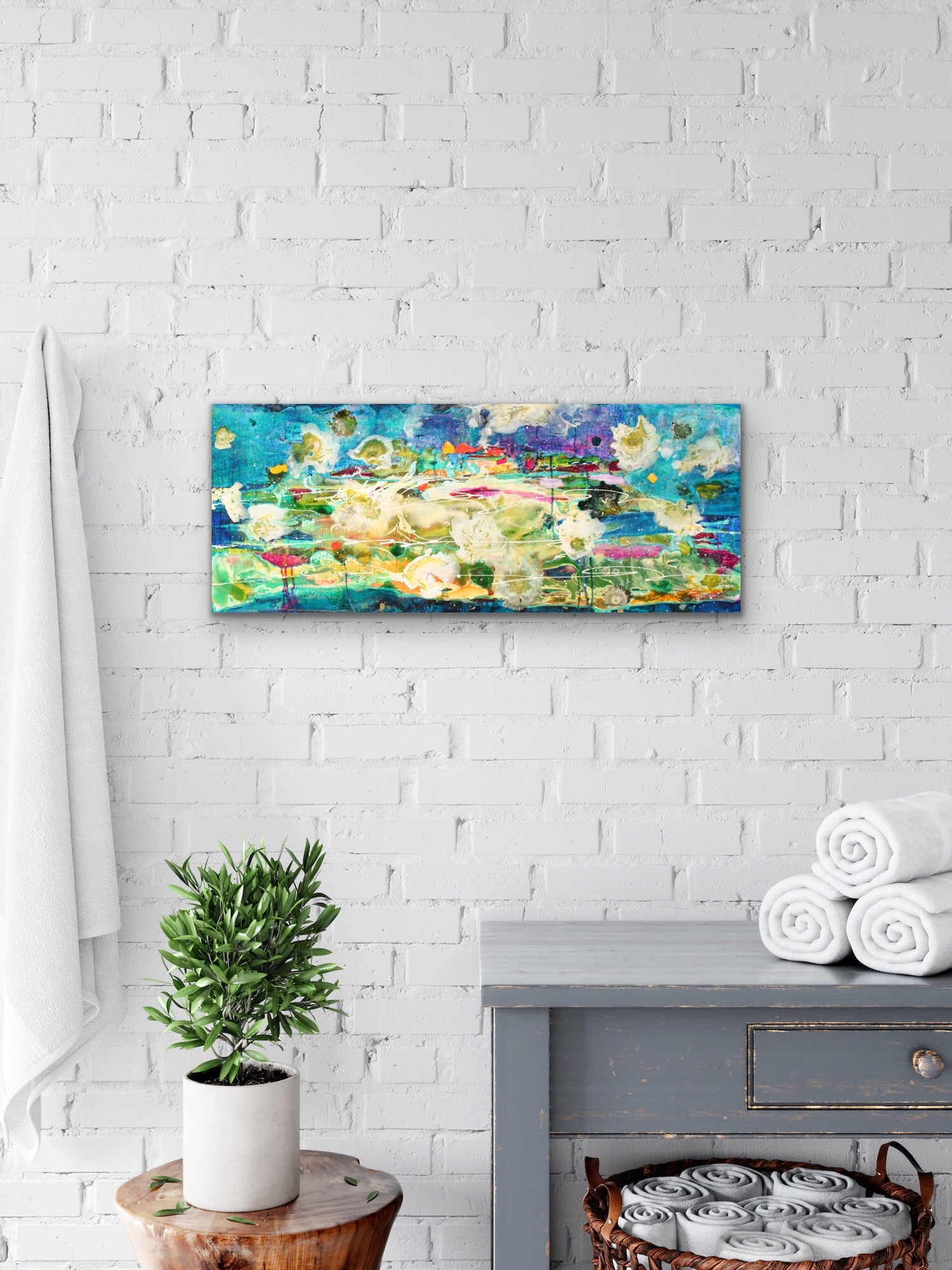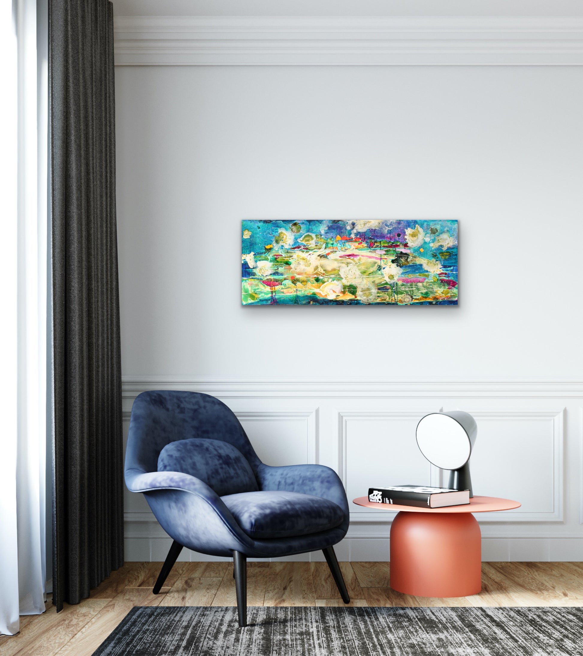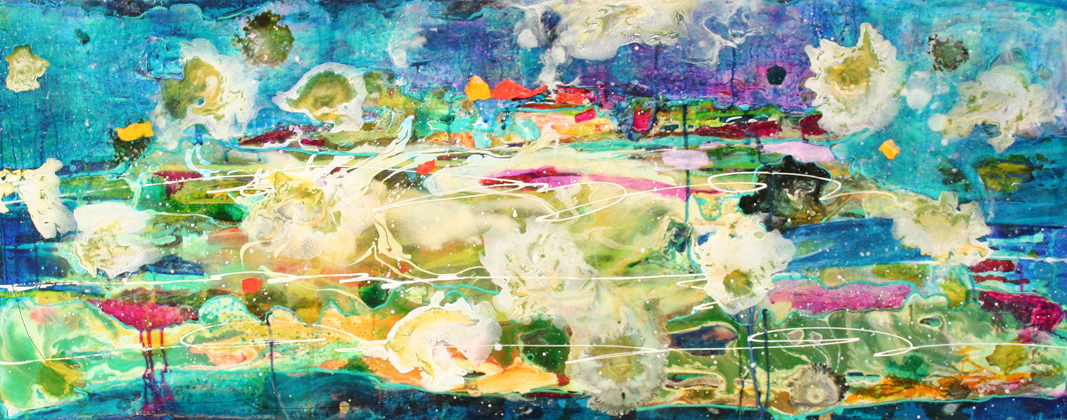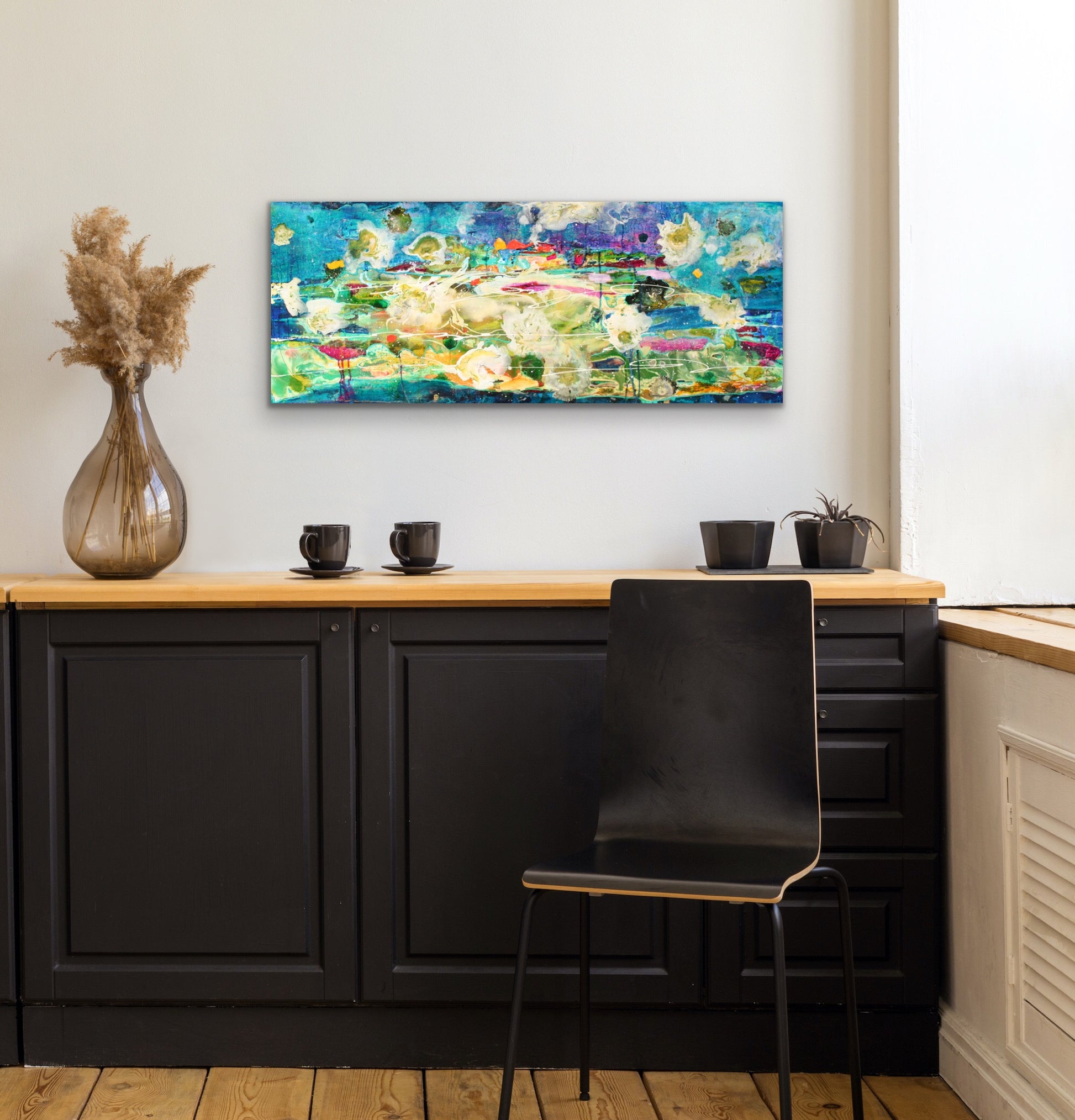 Deep Dive is an exquisite 16x40" original painting on a gallery-wrapped canvas that captures the beauty and depth of the underwater world. Employing layers of acrylic pours, it exudes vibrant colour while creating depth and mystery. Ready to hang, this painting is perfect for those looking for a hint of the sea at home.