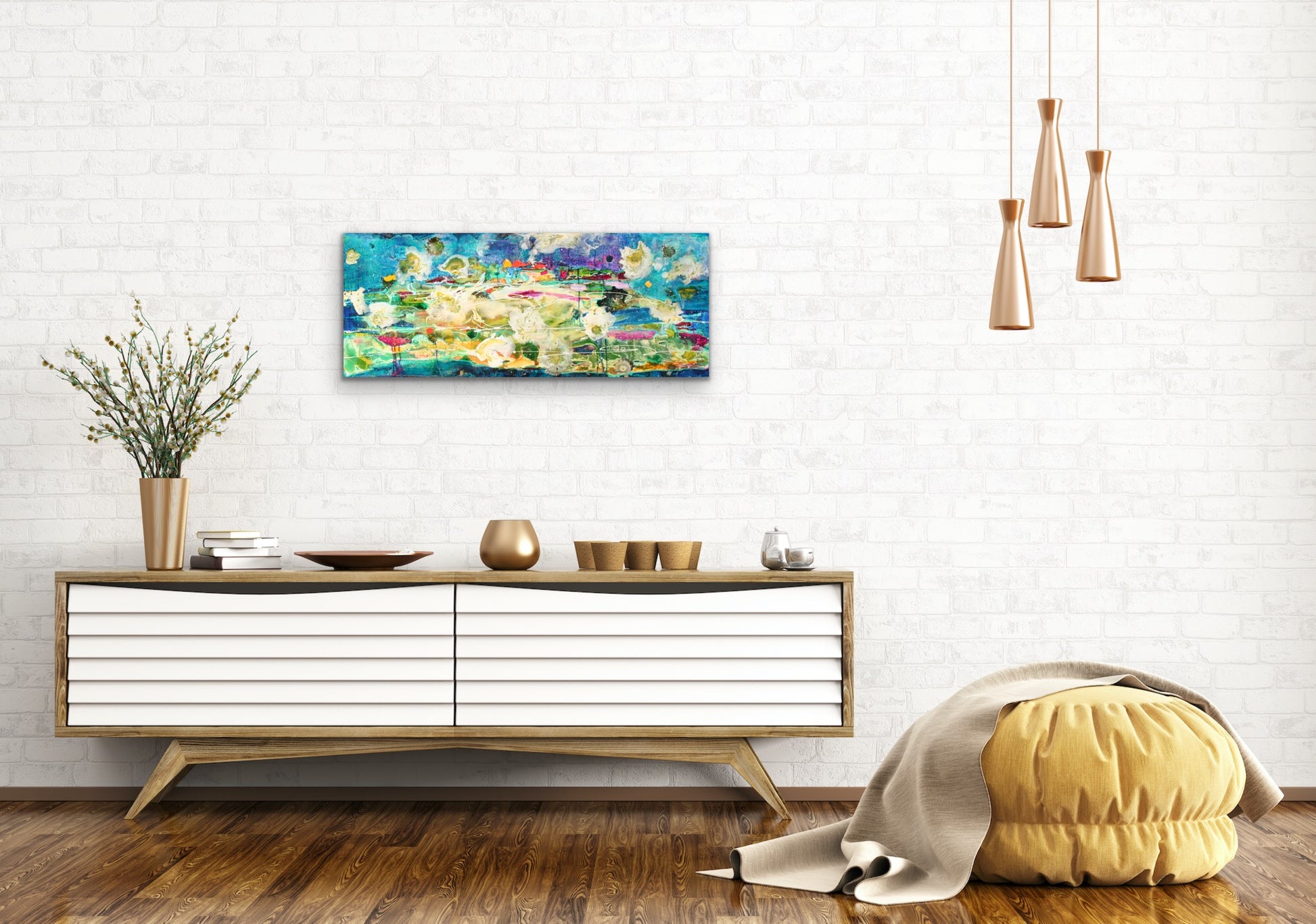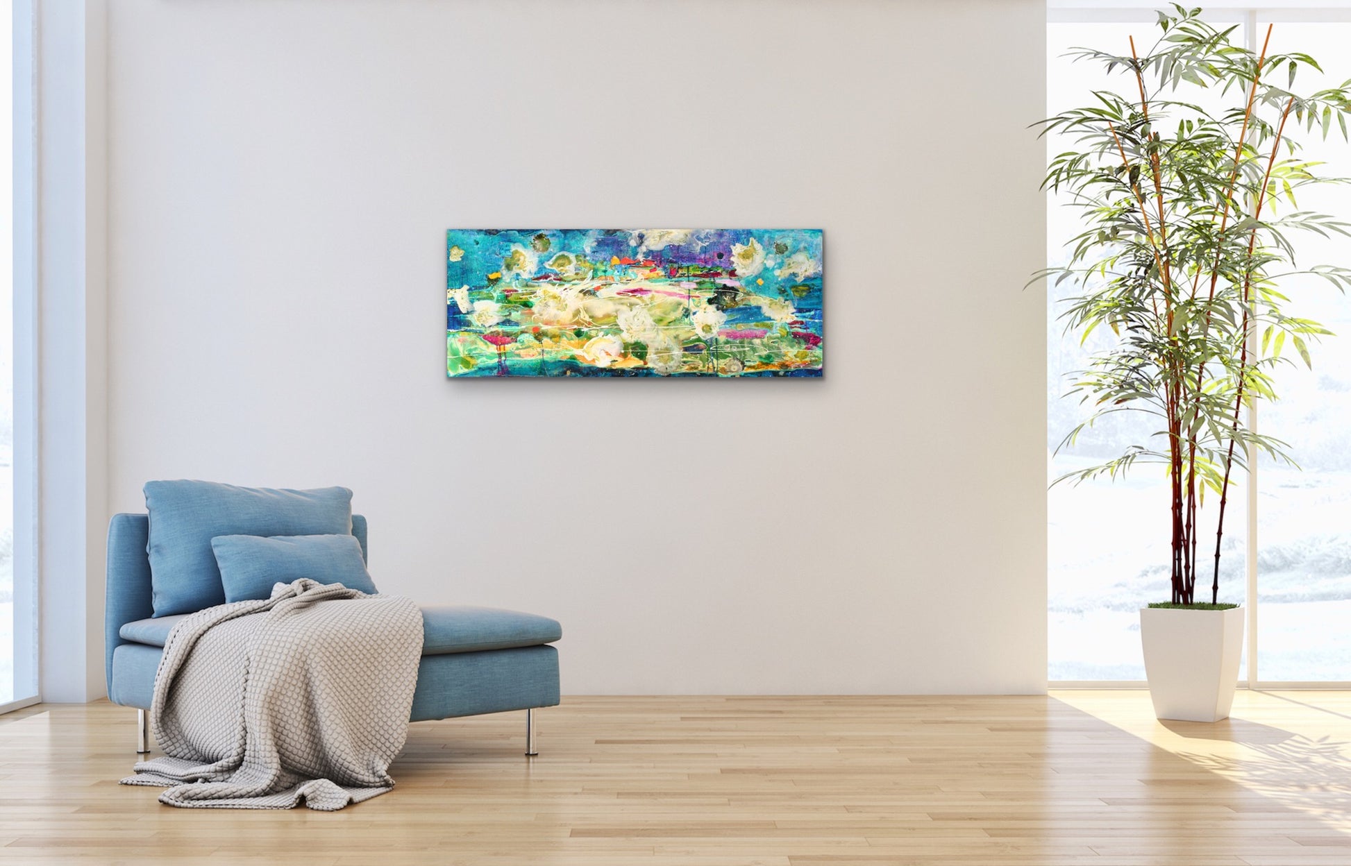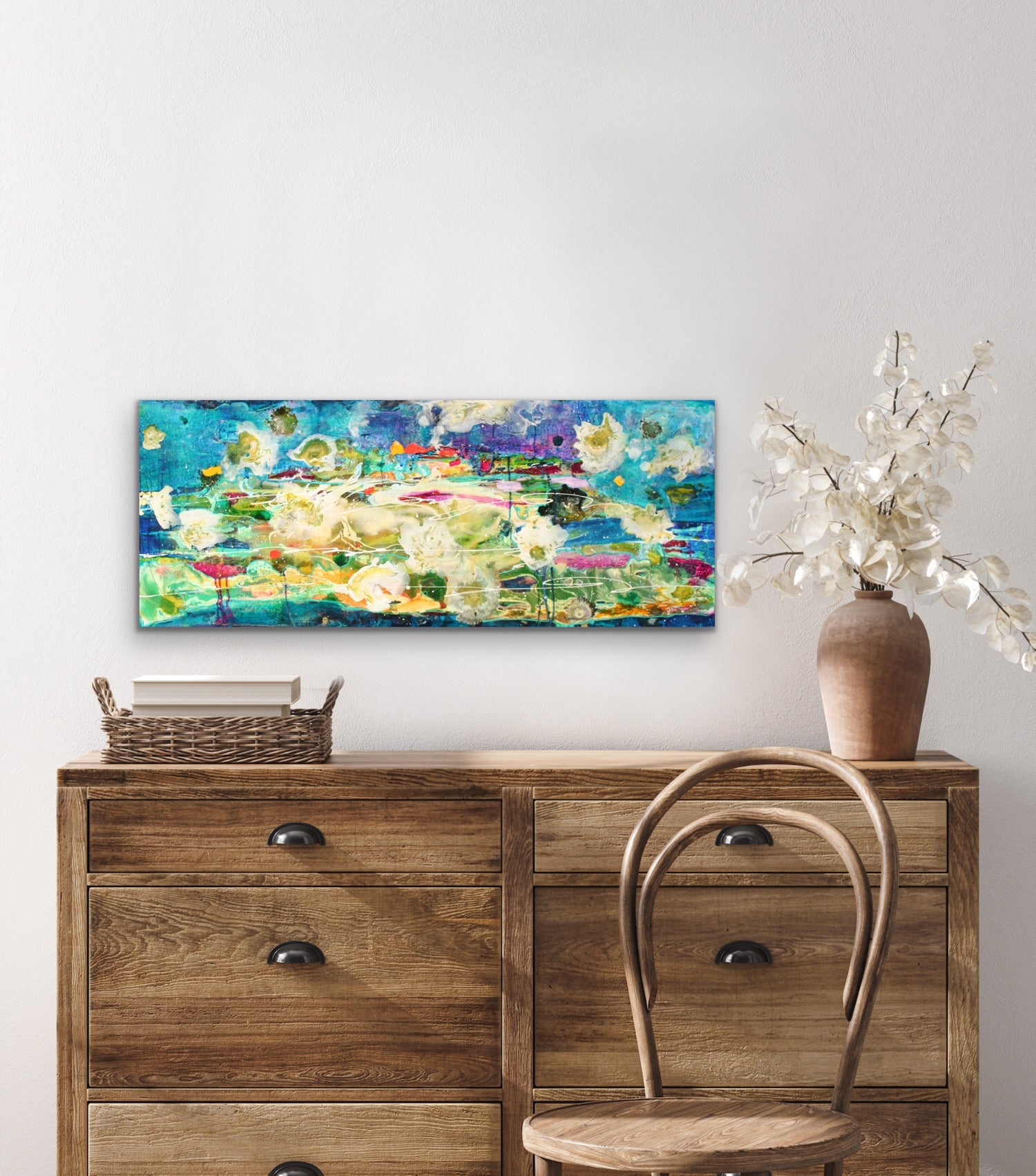 Deep Dive is an exquisite 16x40" original painting on a gallery-wrapped canvas that captures the beauty and depth of the underwater world. Employing layers of acrylic pours, it exudes vibrant colour while creating depth and mystery. Ready to hang, this painting is perfect for those looking for a hint of the sea at home.