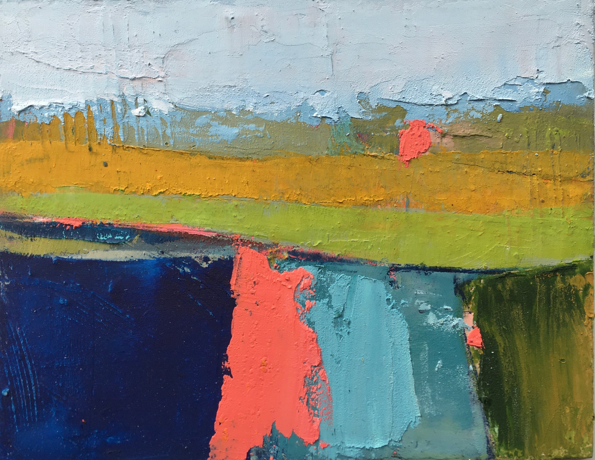 “Filtered Memories” is a cold wax and oil painting done on hardboard.