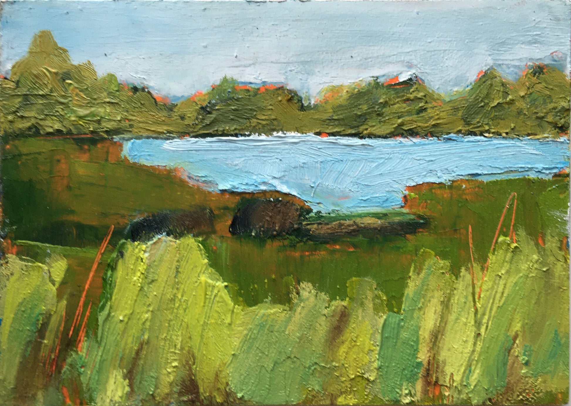 “Grass is Greener on the Other Side " is a cold wax and oil painting done on hardboard.