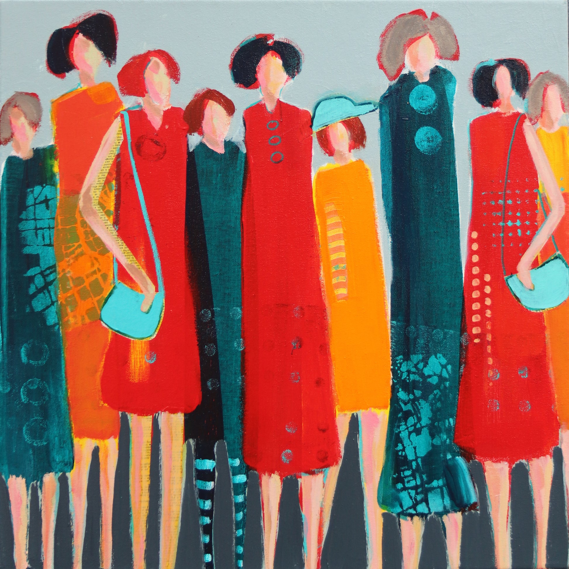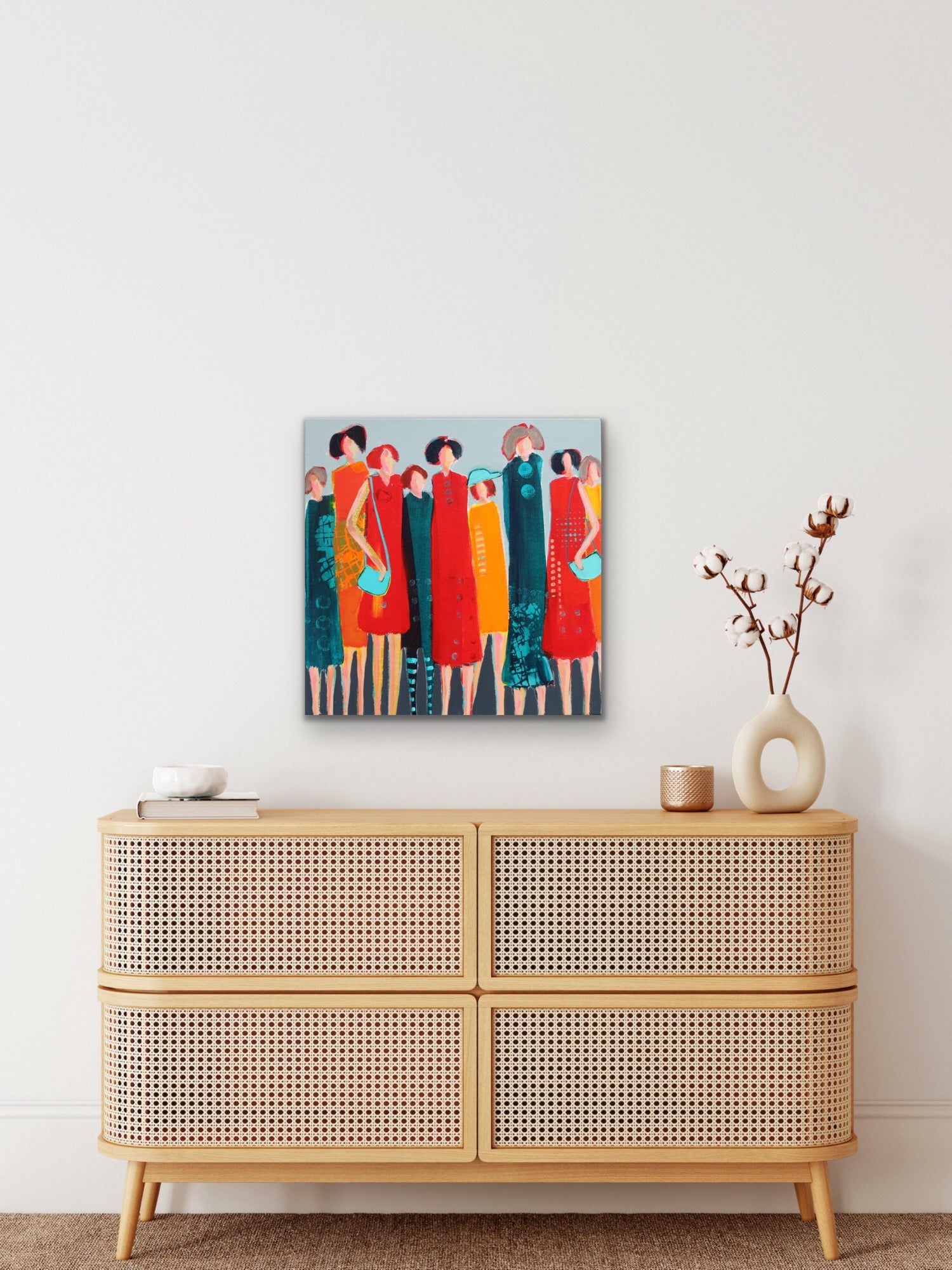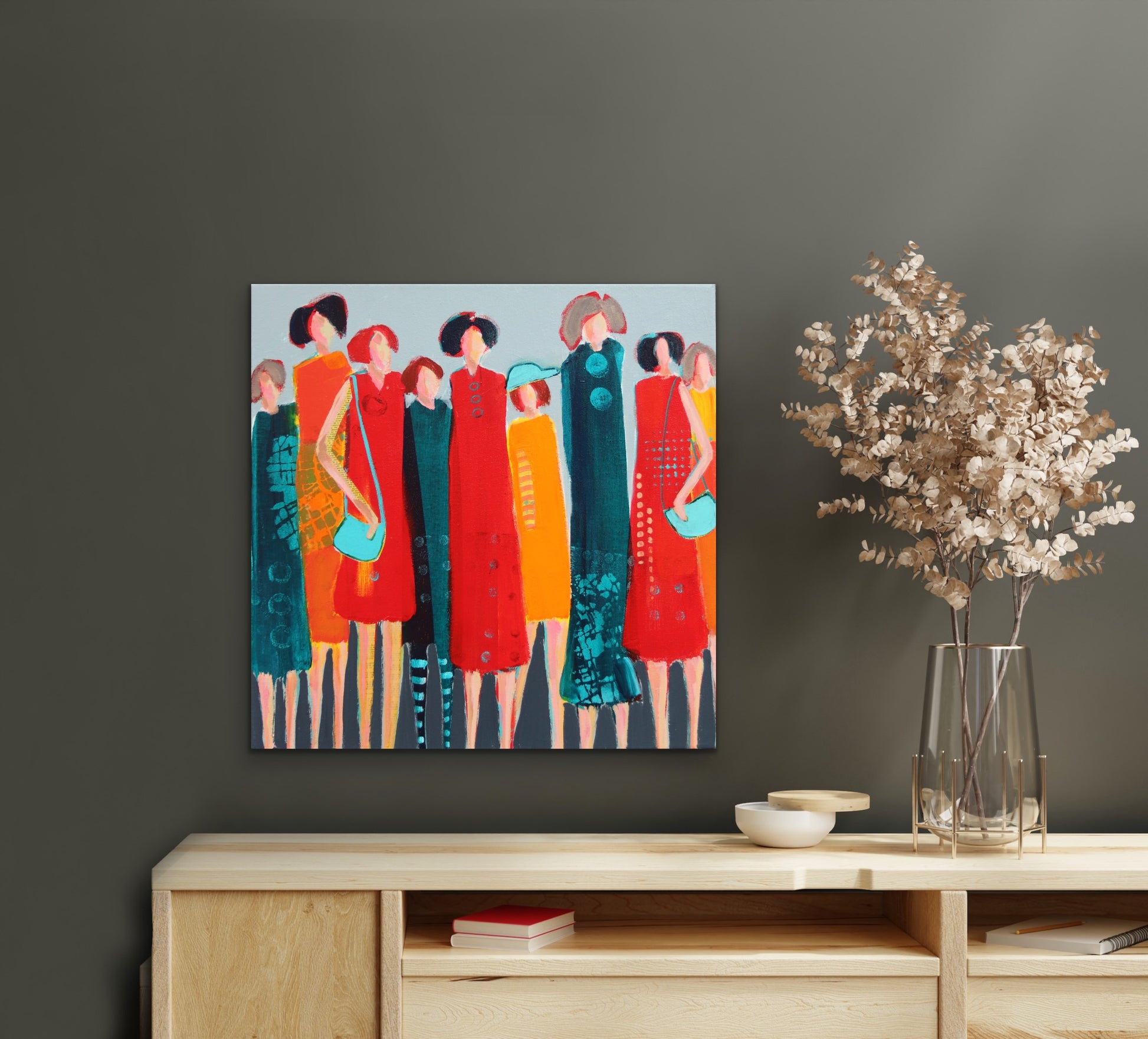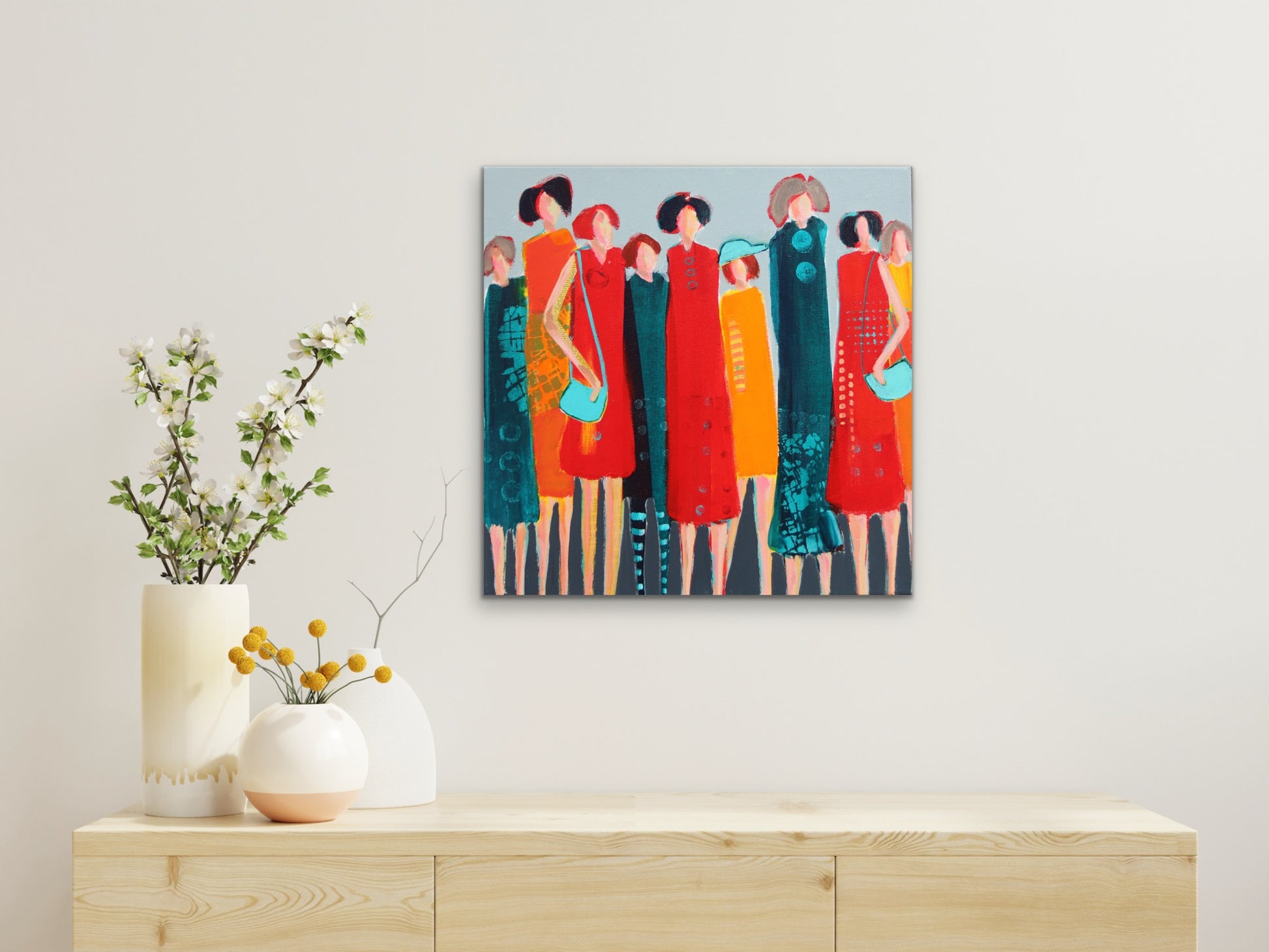 Introducing Groupies, an original acrylic painting on a gallery wrapped canvas. This colourful piece features a group of ladies, ready to bring vibrancy and energy to any room. Hang it with ease and admire its beauty. Perfect for art lovers and collectors. 20x20"