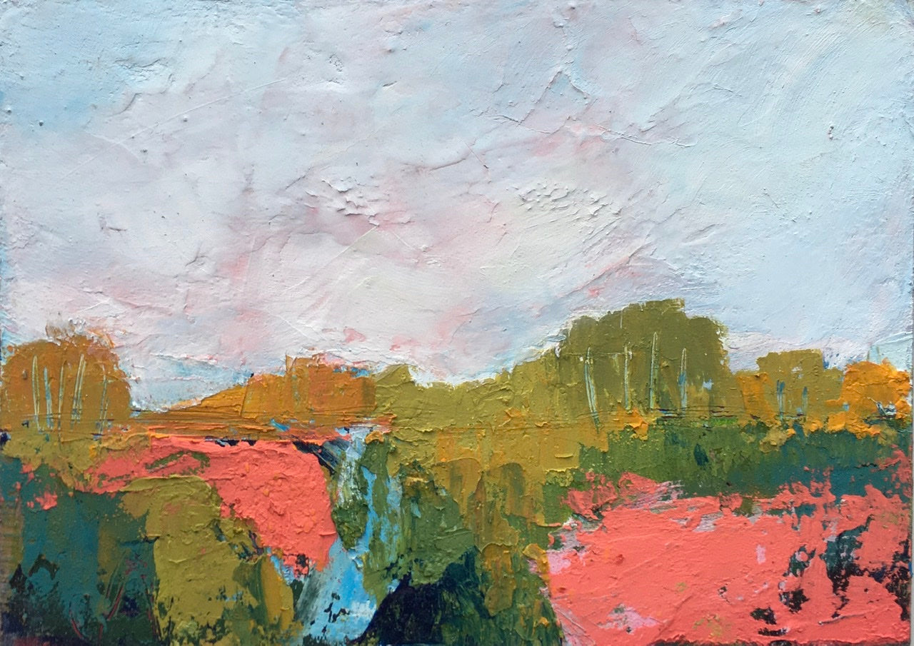 “Into the Sunset " is a cold wax and oil painting done on hardboard.