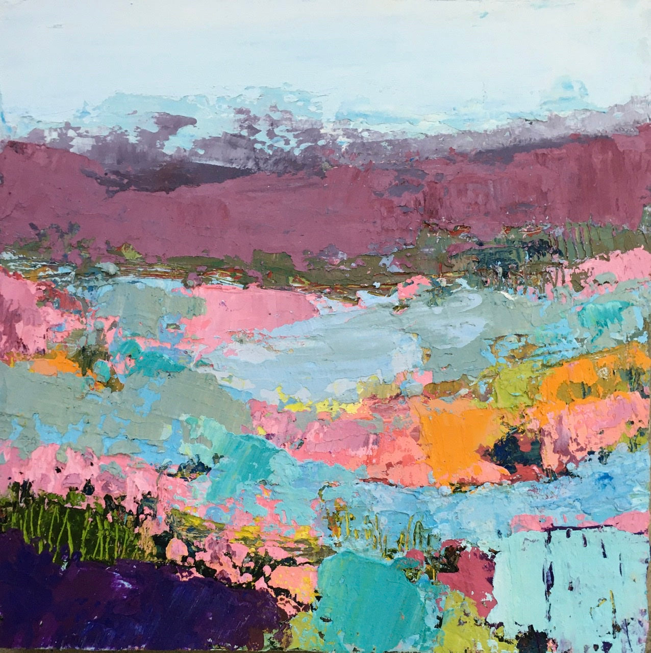 10x10x1” Cold wax and oil paint on a 1” deep cradled panel. A landscape of a summer day full of blooms and a feeling of lushness.