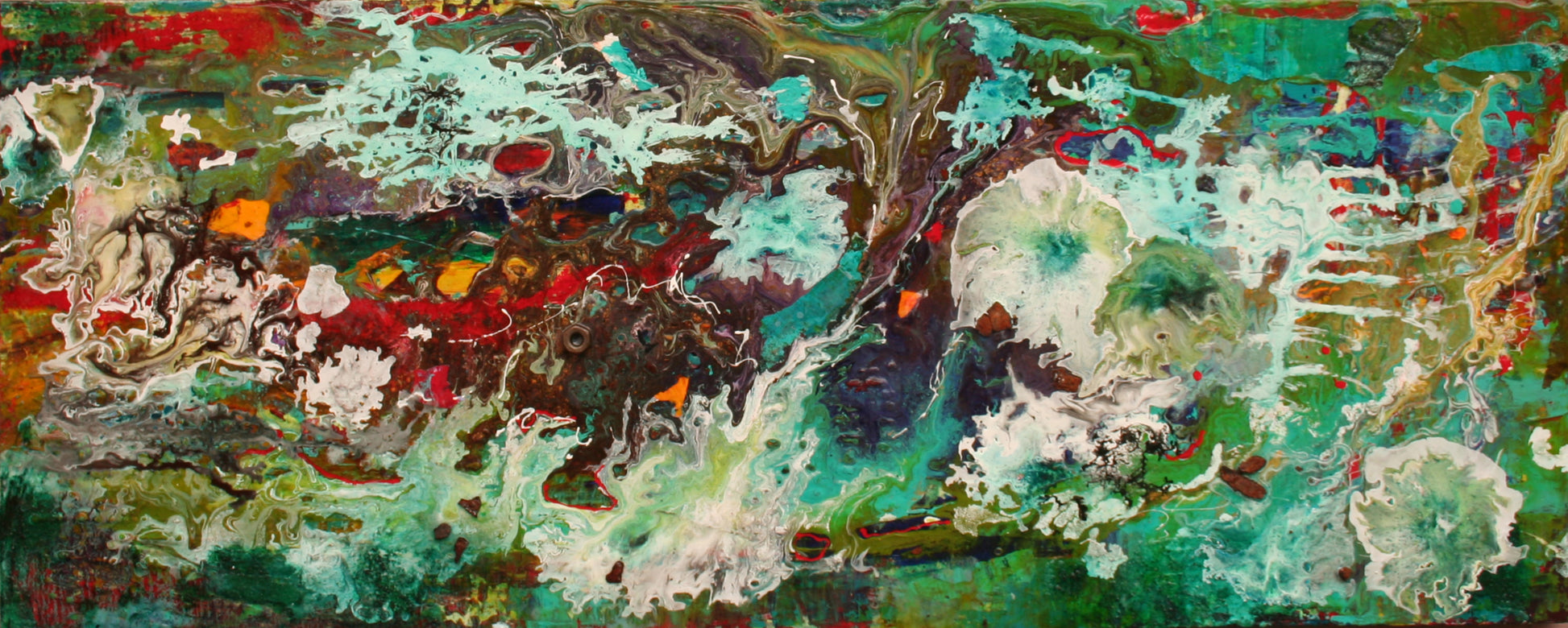 It has been created by building up many pours and manipulating a variety of paint viscosities.