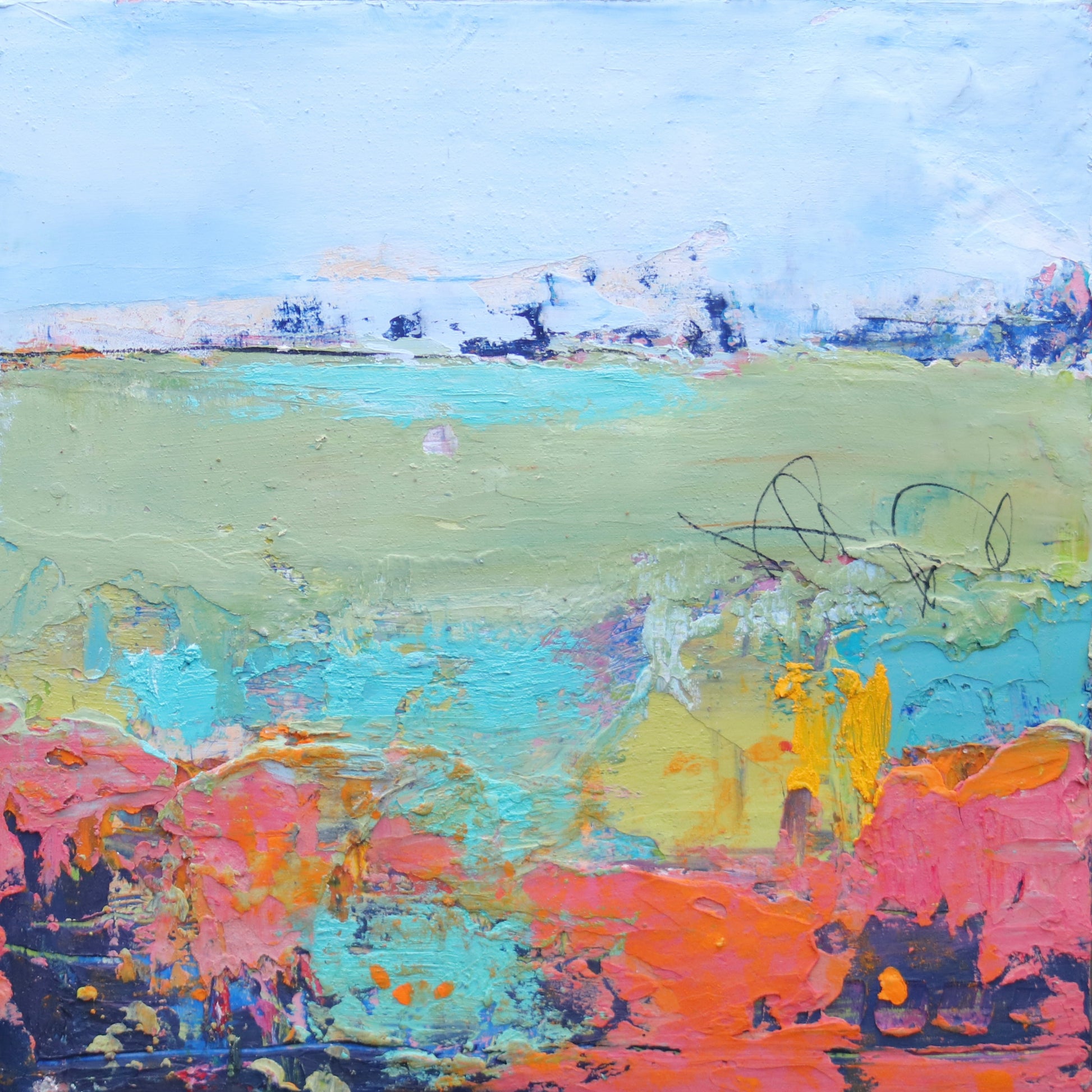 Experience the breathtaking texture and depth of Patt Scrivener AFCA's Meadow Walk series. Each 6x6-inch piece is created using a unique combination of cold wax and oil paint, resulting in one-of-a-kind works of art. The cradled panel and painted edges add a touch of sophistication to these stunning paintings.