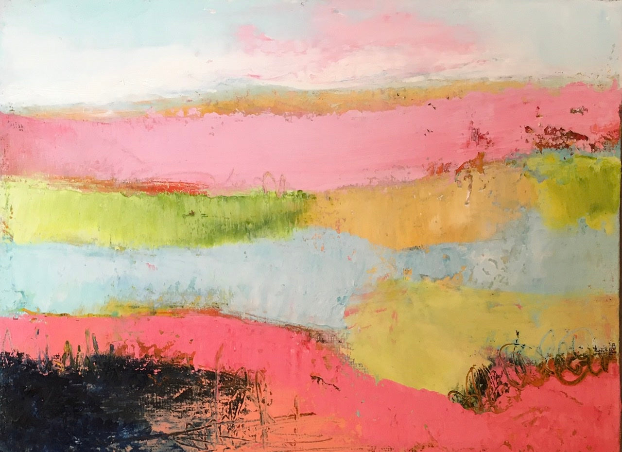 “Pink in the Distance" is a cold wax and oil painting done on hardboard.