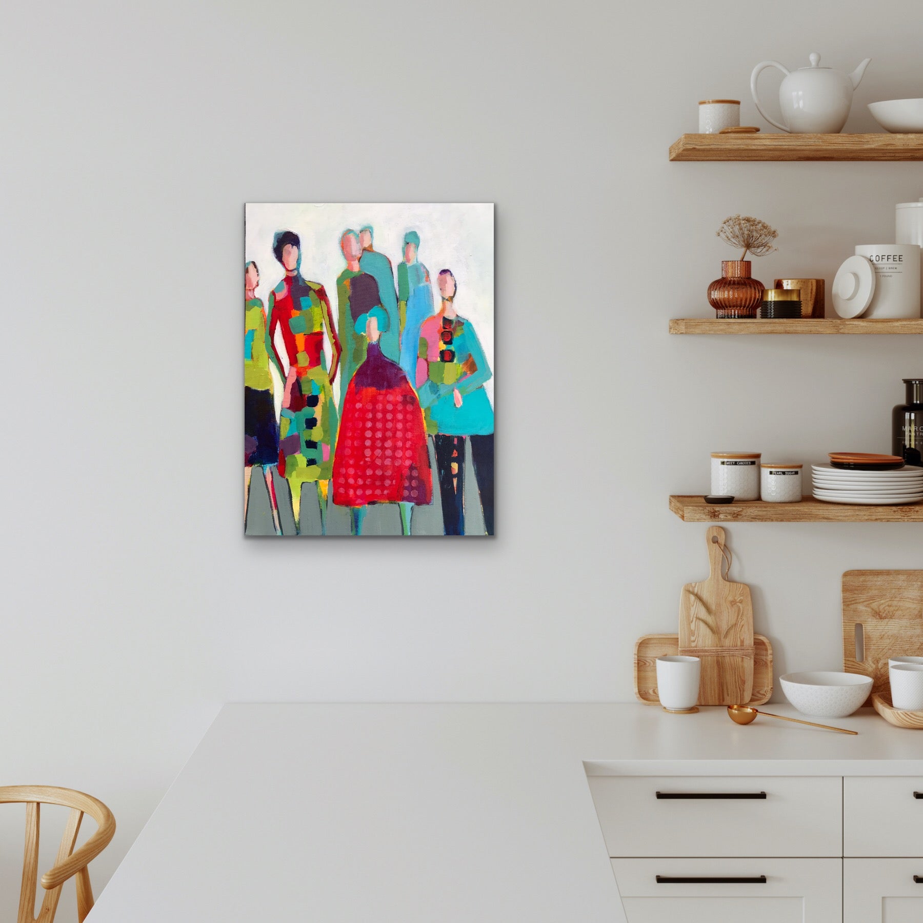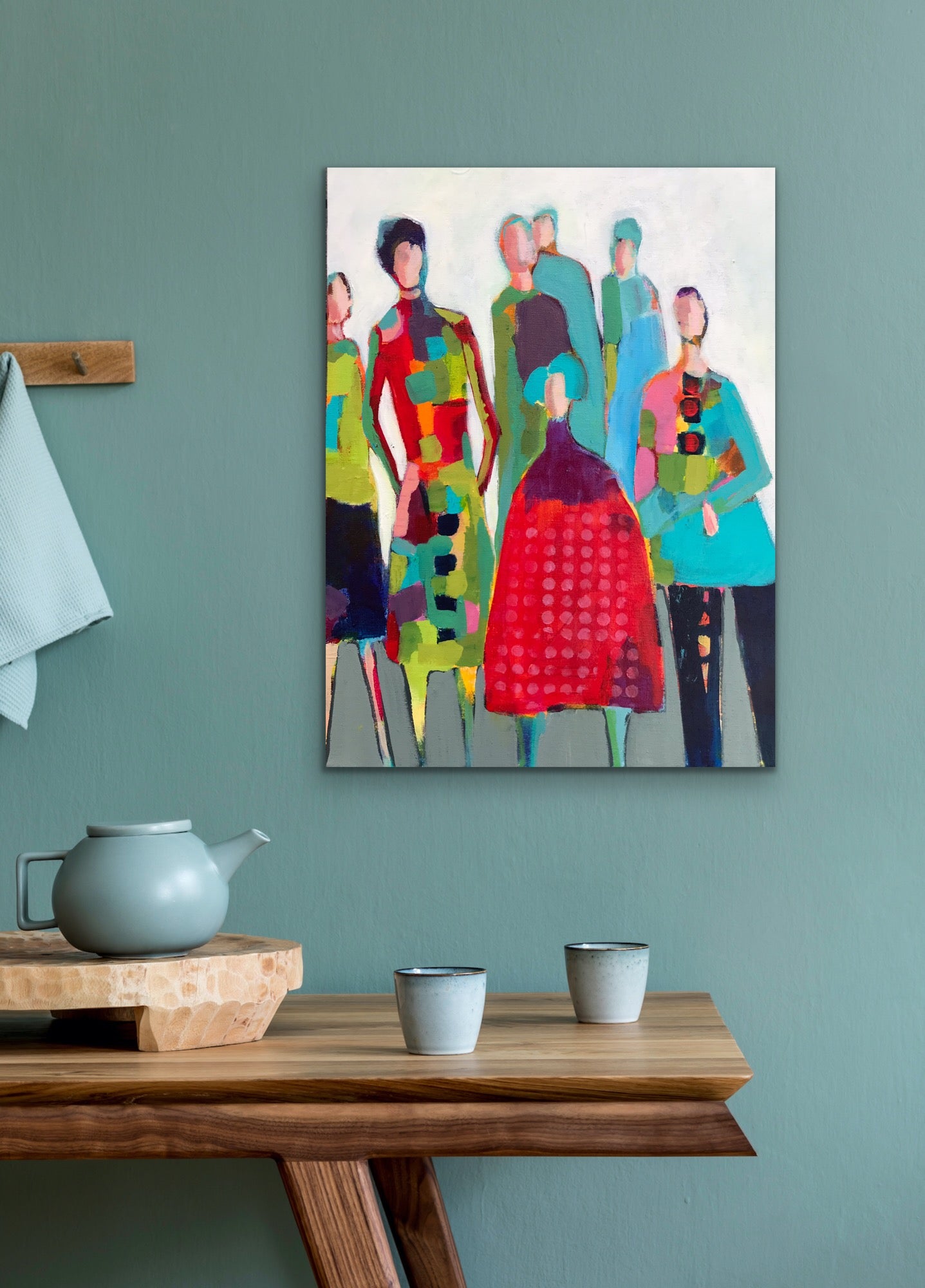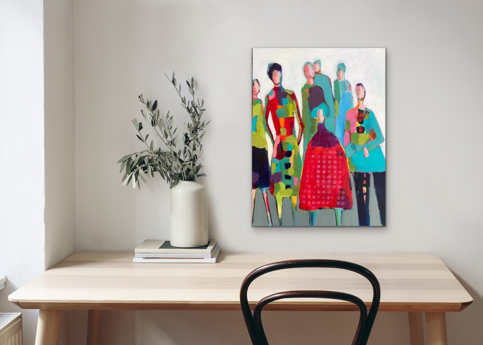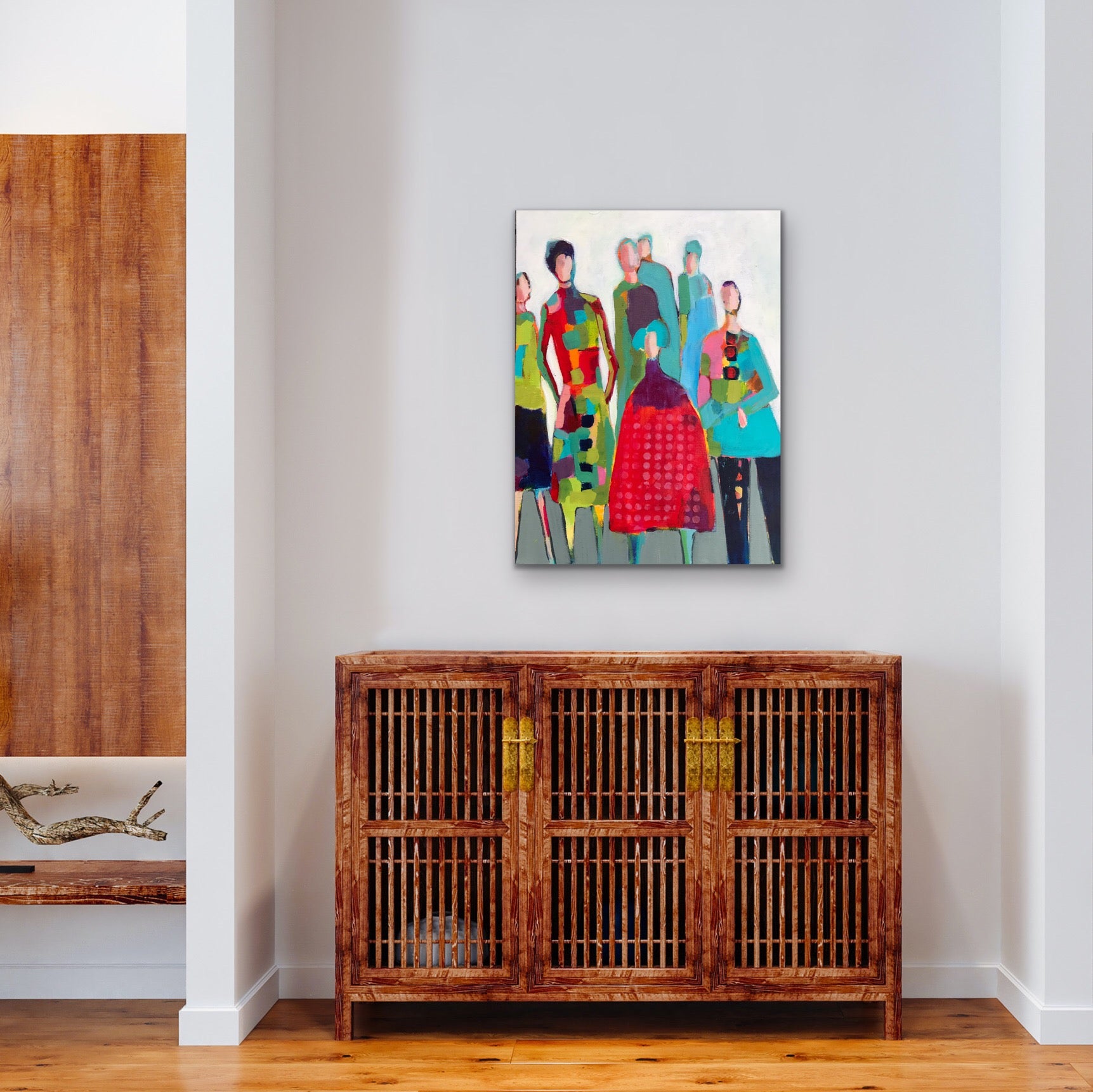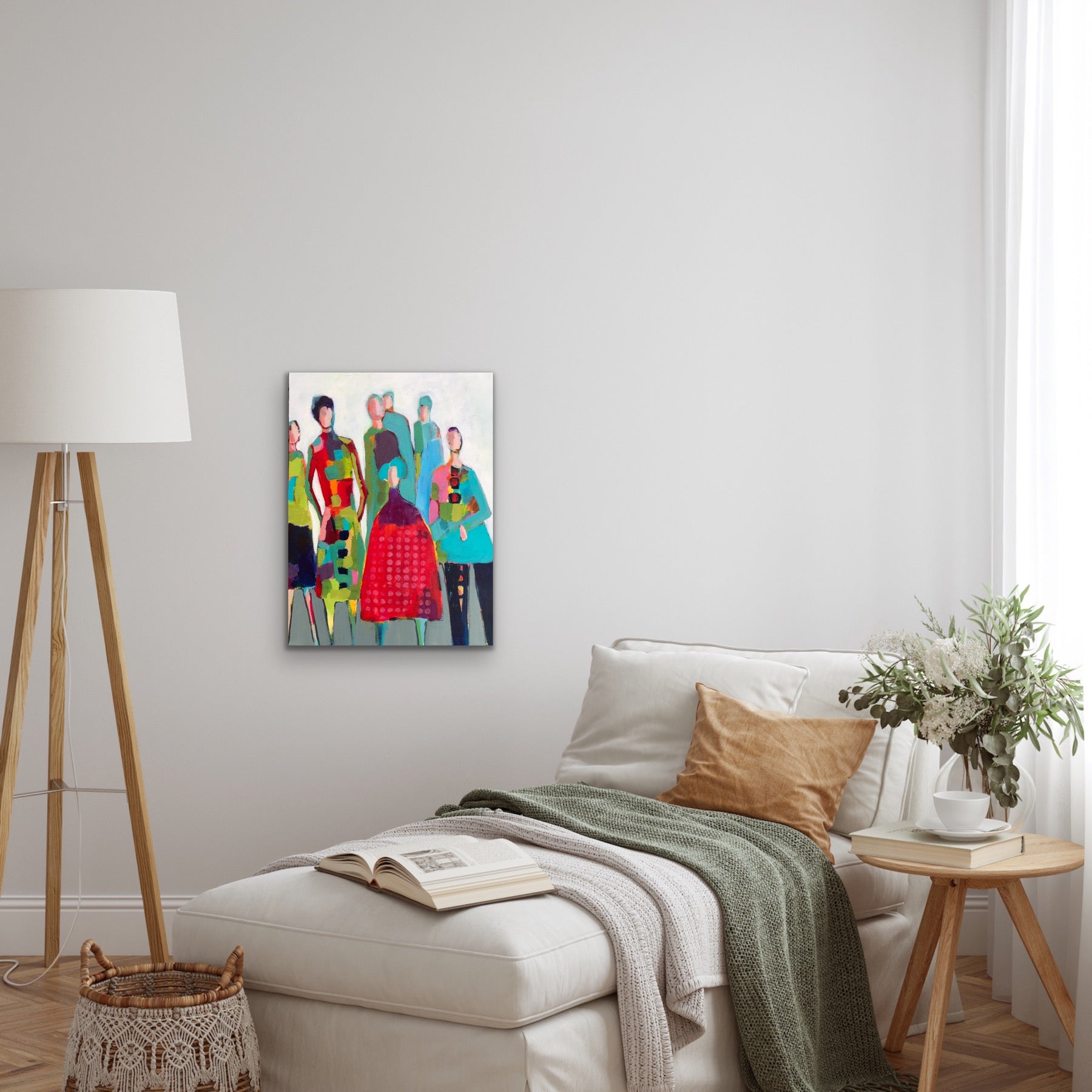 Introducing Small and Mighty - this colourful original acrylic painting captures the strength and power of a group of women with a leader of the pack! Its small size packs a punch and will make a statement in any space. Elevate your art collection with this exclusive piece.