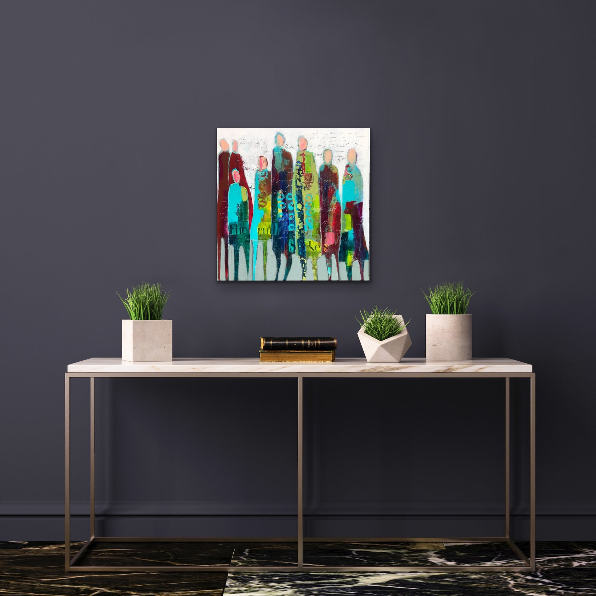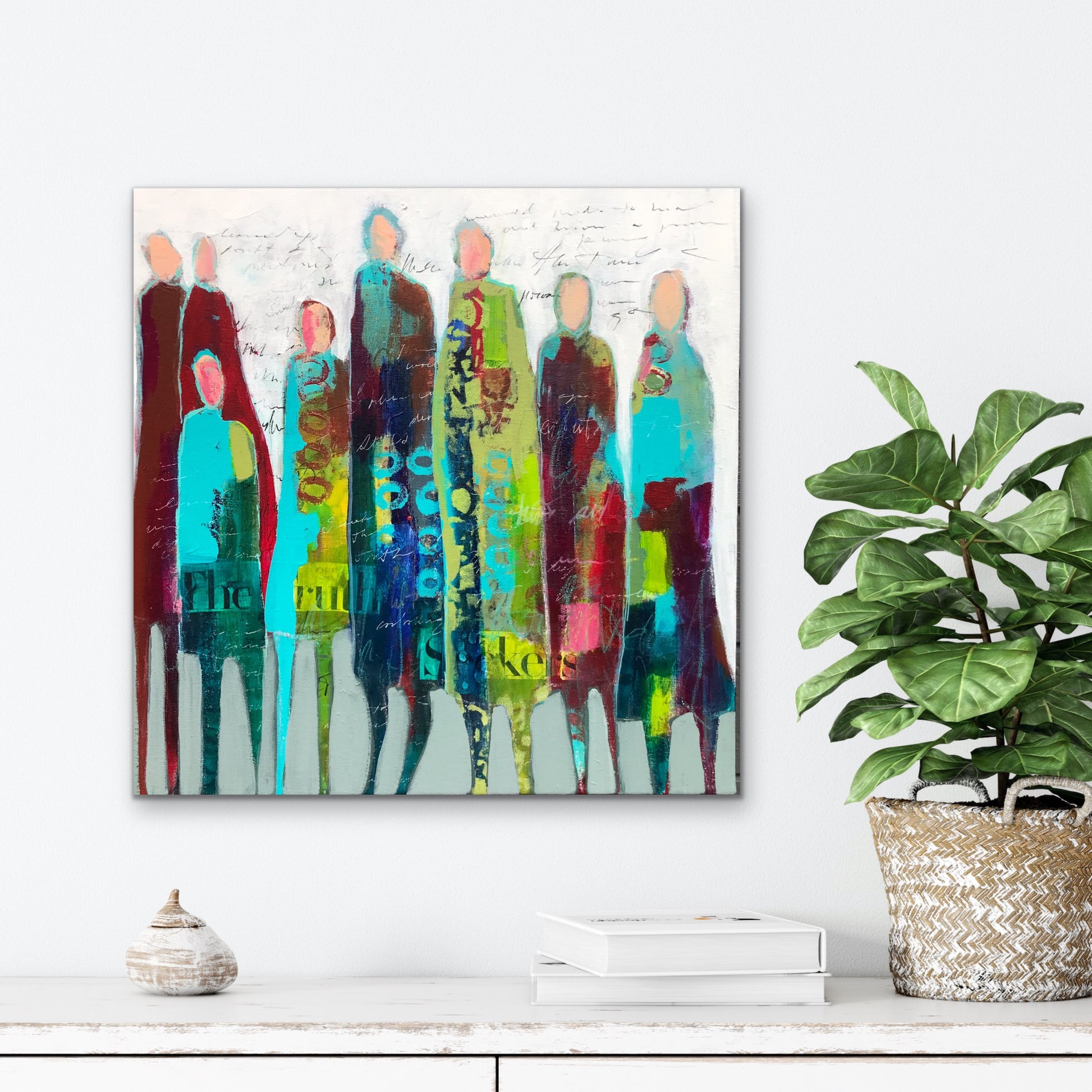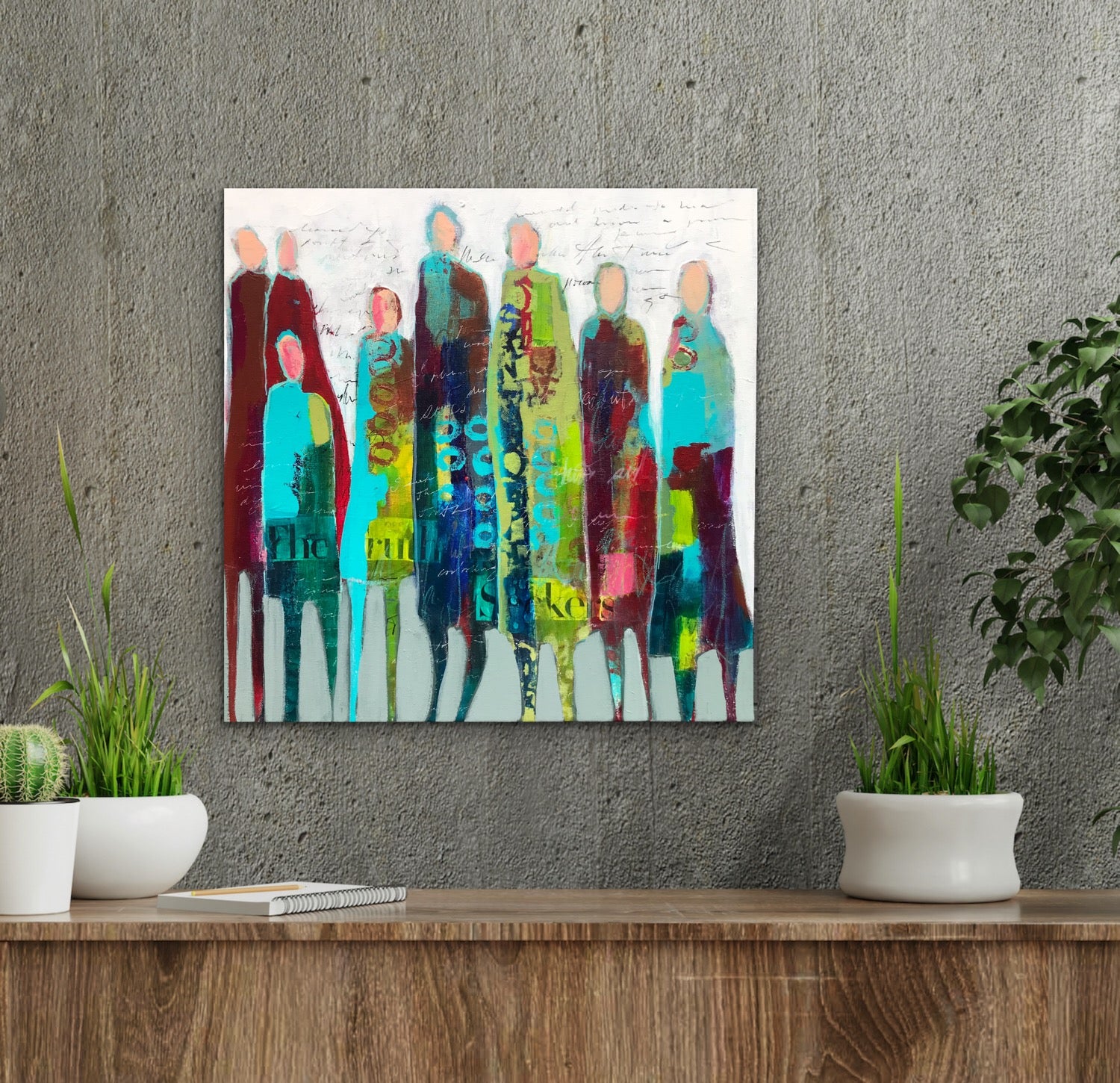 Be the center of attention with The Ringleader. This original acrylic and collage painting features a bold, colorful group of women in blue, green, and burgundy. Embody the power and confidence of a true ringleader with this exclusive piece.