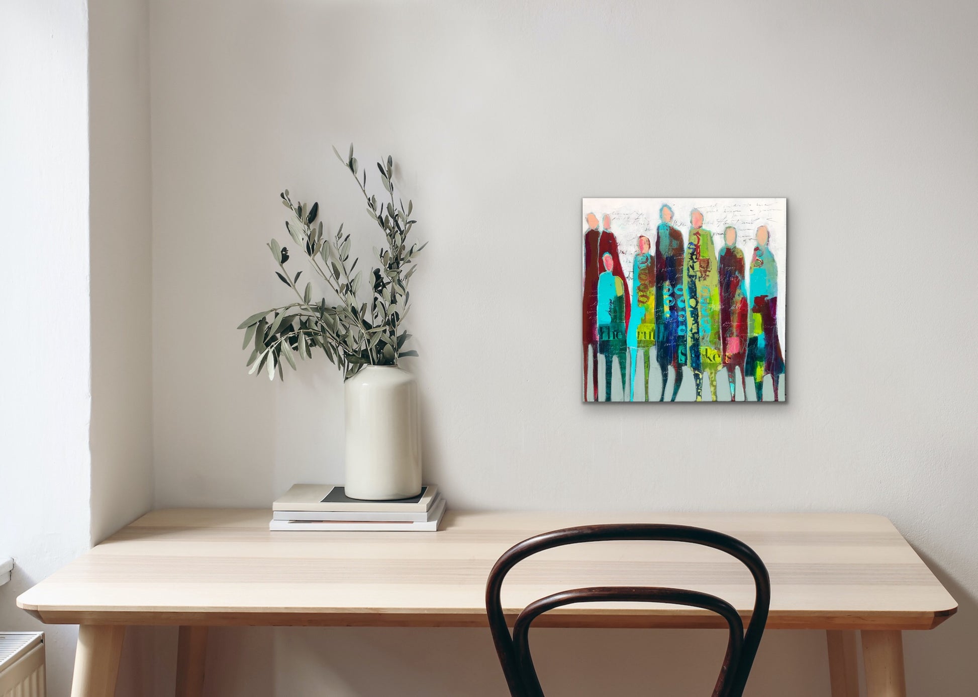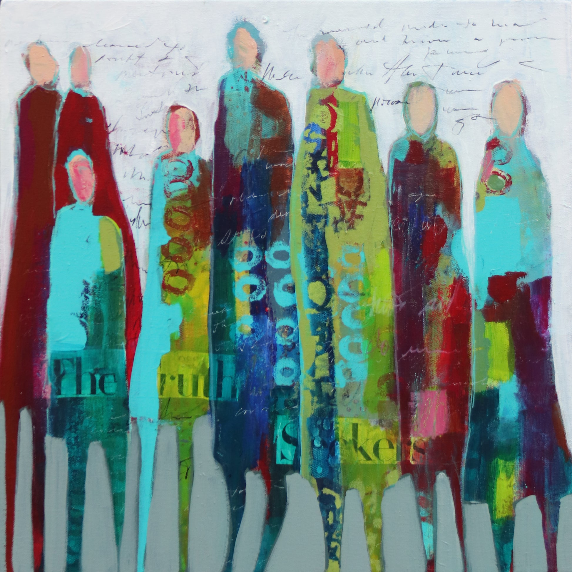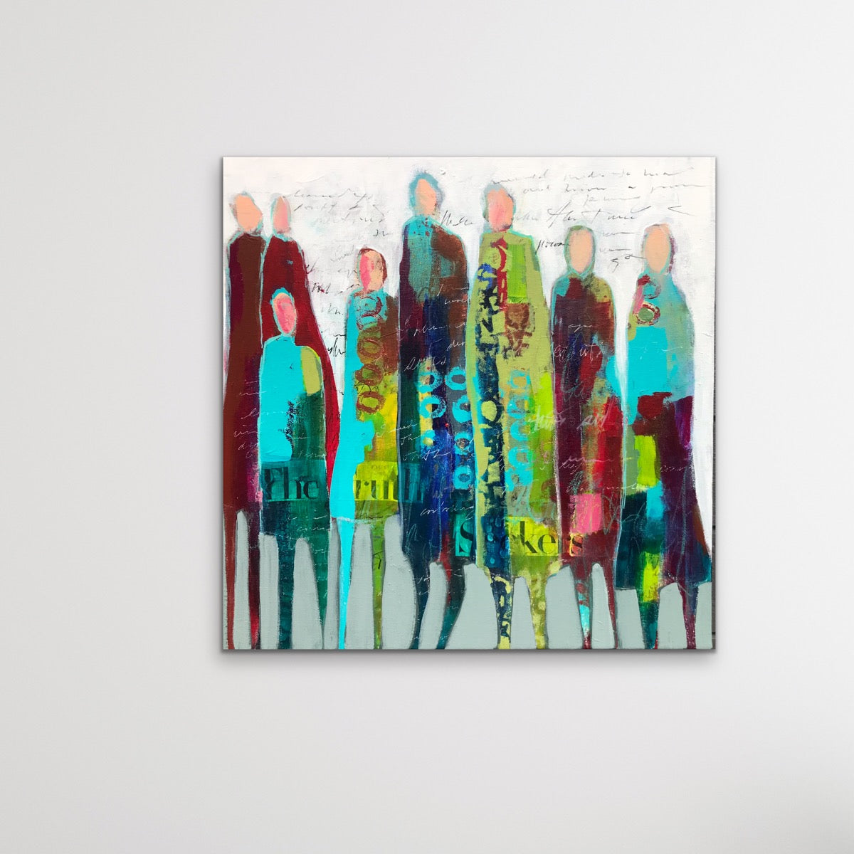 Be the center of attention with The Ringleader. This original acrylic and collage painting features a bold, colorful group of women in blue, green, and burgundy. Embody the power and confidence of a true ringleader with this exclusive piece.
